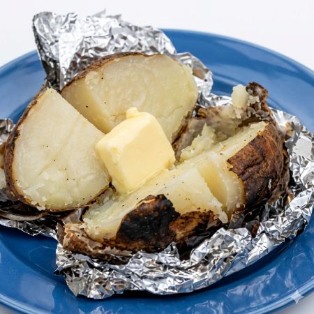 じゃがバター3個入り アルミホイルで包んであります。 そのまま火のついた炭の中に投入してください。 途中何回か転がして約1時間出来上がりです。 付属のバター、塩を使用してお召し上がりください。