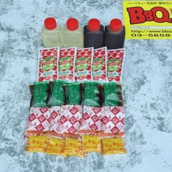 | (塩コショウ、醤油、ケチャップ、からし、焼肉のたれ、サラダオイル) |